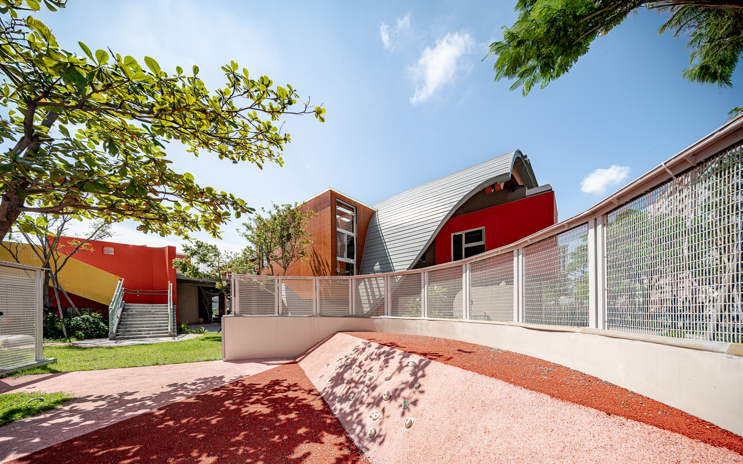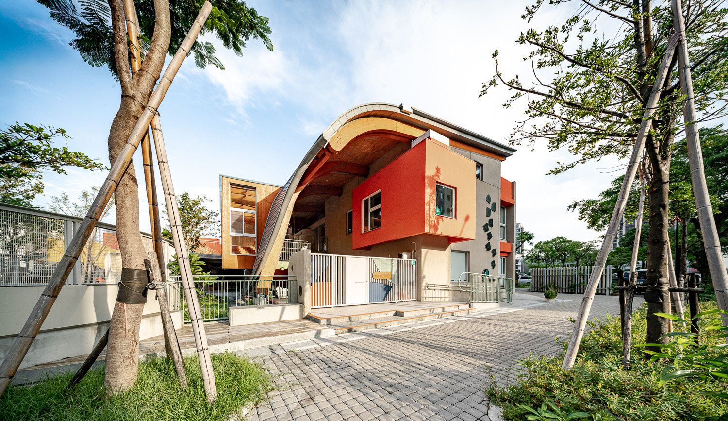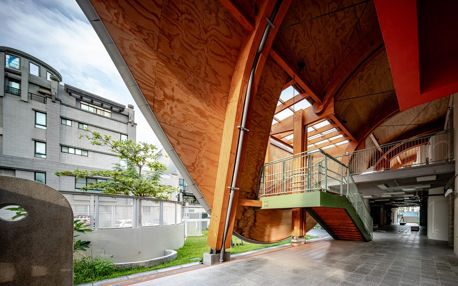 我們以曲線描繪了一座童年的生活與學習場域。 弧,不僅是結構的形式語言,也是一種柔軟、開放、連續的空間姿態。 弧線出現在建築的平立剖面上,劃訂了木構屋頂的天際線,讓天光灑落;也時而是樓板上的自由山稜線,成為孩子的遊戲場。 孩子在光影與曲線構築而成的環境中,編織探索特有的學齡前成長記憶。